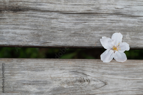 Fototapeta premium ベンチ上に落ちた一輪のソメイヨシノの花