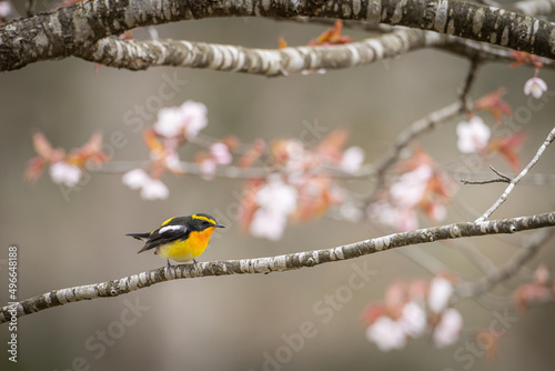 Naklejka premium 北海道の5月、遅い春に山桜とキビタキ。
