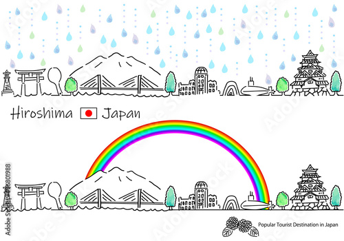 © RURIBYAKU, Naklejka premium 雨の広島の観光地の街並シンプル手描き線画セット