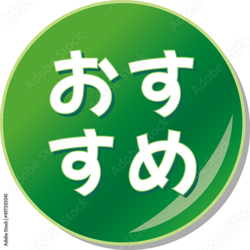 © tota, Obraz premium 「おすすめ」の文字が描かれた緑色の缶バッチアイコンのベクターイラスト