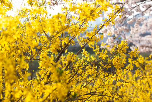 Obraz premium 개나리와 벚꽃이 만개한 봄날 모습
