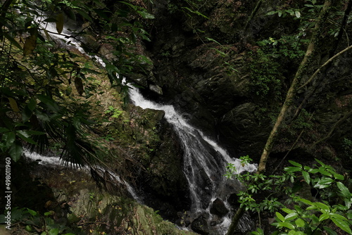 Obraz premium 新緑の森の中の滝を上から見る