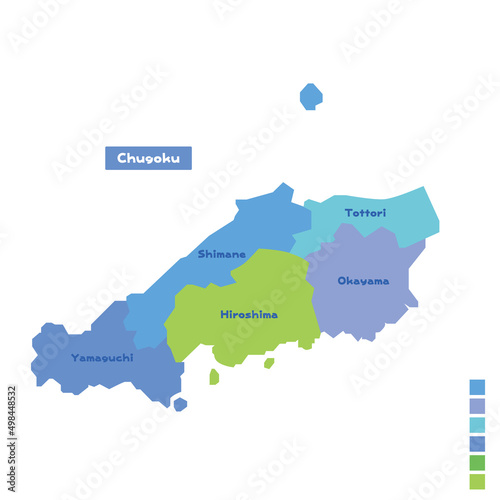 Obraz premium 日本の地域図・日本地図 中国地方 雨の日カラーで色分けしてみた(英語版)