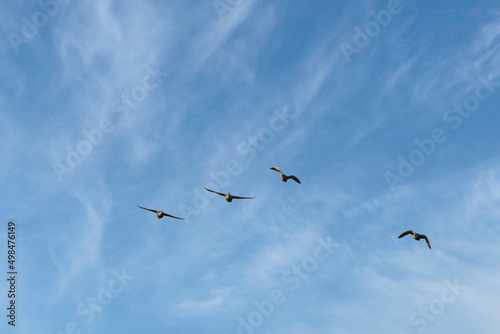 Fototapeta premium 快晴の青空を、心地よく羽ばたく野生のカモの群れ