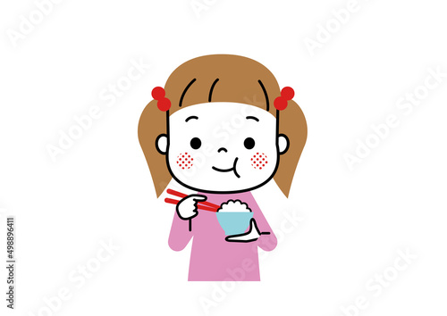 © taeco, Fototapeta premium ほっぺたを膨らませてごはんをおいしそうに食べている女の子