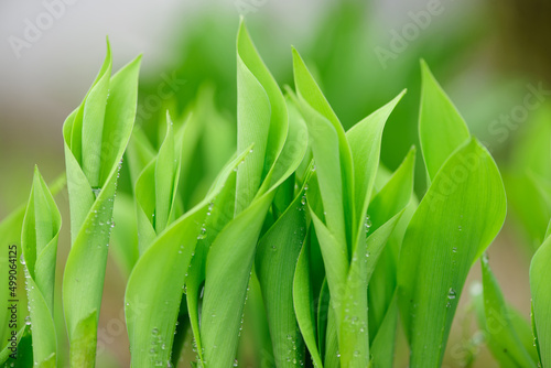 Obraz premium 雨の雫が滴る鈴蘭の芽生え