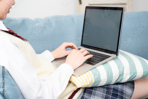 Fototapeta premium ソファーでラップトップを操作している女子高生