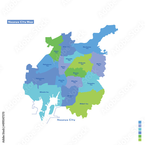 Obraz premium 名古屋市行政区・名古屋市地図 雨の日カラーで色分けしてみた(英語版)