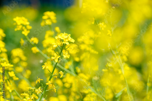 Obraz premium 風に揺れる黄色い花が前ボケになった春の菜の花畑