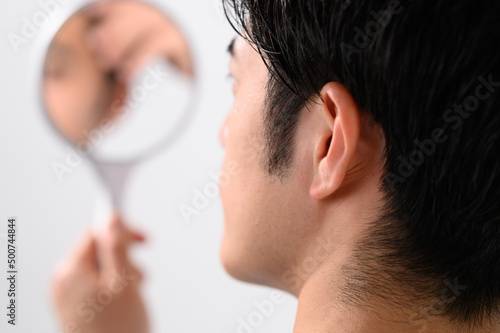 Obraz premium 手鏡で顔をチェックする男性 メンズ美容