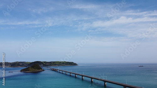 Fototapeta premium 角島大橋 ドローン空撮空からの眺め 角島と青い空とエメラルドグリーンとブルーの海
