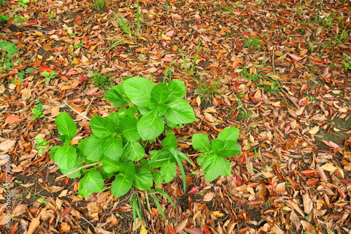 Obraz premium 樟の春の枯れ葉と新緑の紫陽花