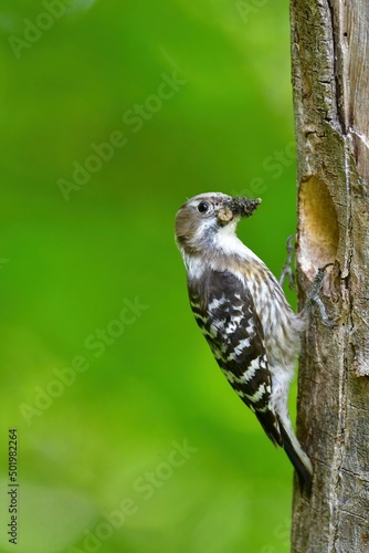 Naklejka premium ゴールデンウィークの新緑の公園で子育てに励む身近な小鳥コゲラ