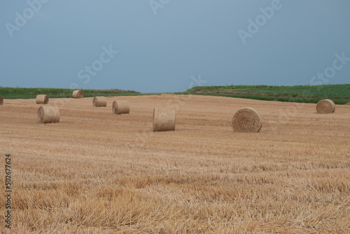 © kinpouge, Fototapeta premium 刈取が終わった後のムギ畑の麦ロール