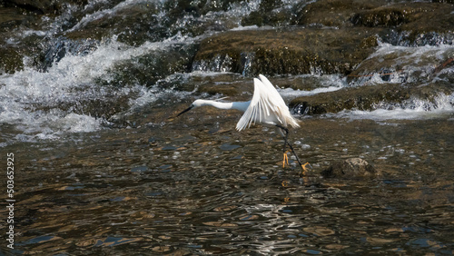 © sephoto, Fototapeta premium 시냇물에서 물고기 사냥을 즐기는 백로 한 마리