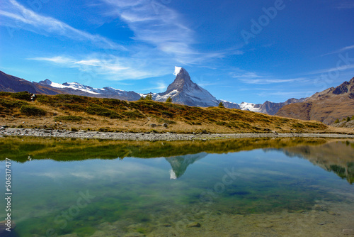 Fototapeta premium スネガパラダイスのライゼー湖に映る逆さマッターホルン