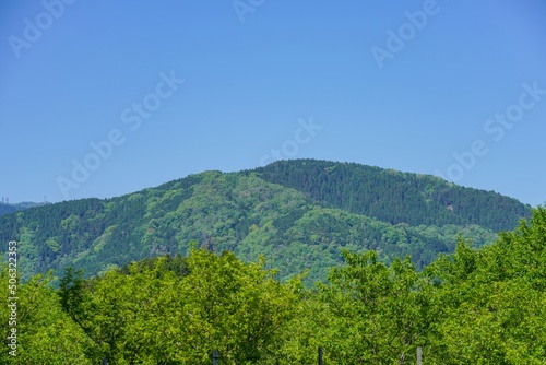 Obraz premium 萌黄色の新緑の山の情景@滋賀