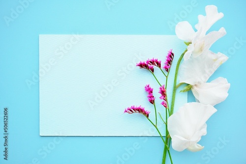 Naklejka premium 青バックに白いスイートピーと赤紫色のスターチスを添えたかわいいタイトルカードのモックアップ