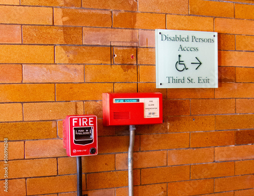 Fototapeta premium アメリカの街中、レンガ壁に設置された器具と案内板の横フレーム