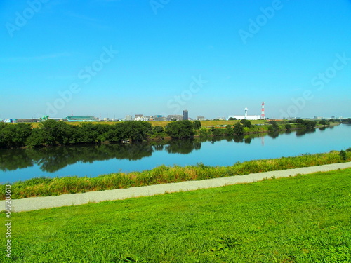 © smtd3, Obraz premium 土手の上から見る秋の青空を映す江戸川風景