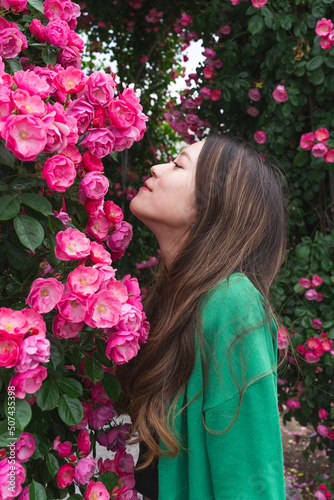 © peach100, Fototapeta premium バラ園にいるロングヘアの女性