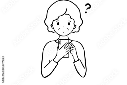 © Hi Na, Fototapeta premium スマホで疑問を抱くシニア女性のモノクロ線画イラスト