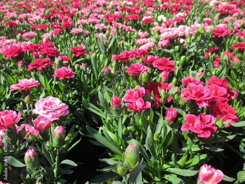 Fototapeta premium 春の花壇に美しく咲き誇る、色とりどりの美しいカーネーション