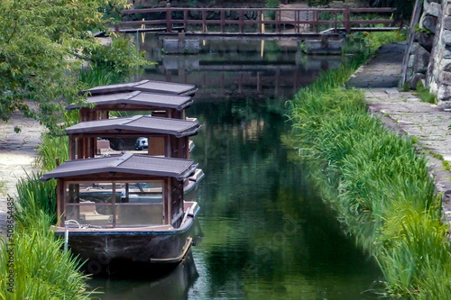 © MTBS PHOTO, Obraz premium 滋賀県近江八幡市 時代劇の舞台にもなる八幡堀 お堀めぐりの観光船が並ぶ 静かな風景