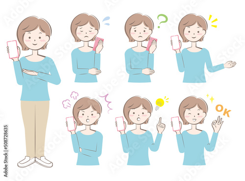 Obraz premium スマホを持つ様々な表情の女性 全身 上半身 バリエーション