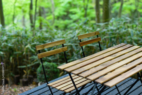 Fototapeta premium 静かな森にある木製のテーブルとイス