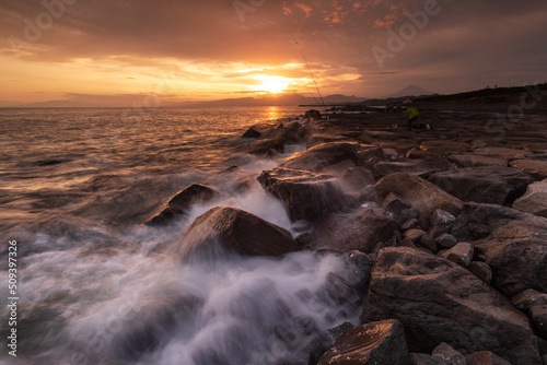 Obraz premium 富士山と夕日と波