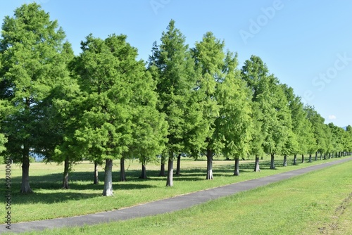 © BJ, Fototapeta premium メタセコイヤ、メタセコイヤ並木、滋賀県、びわ湖、初夏、青空