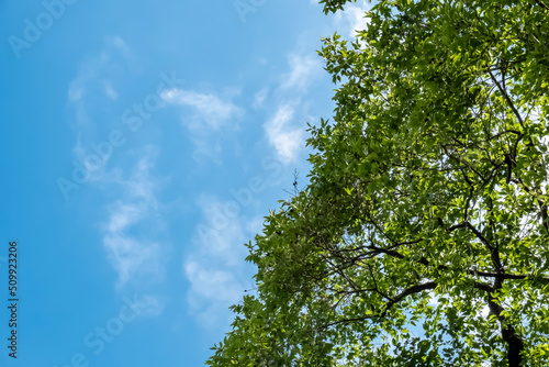 Obraz premium 初夏の青空 緑の木 見上げる
