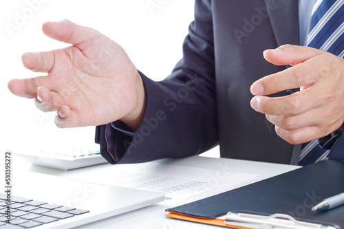 © 琢也 栂, Obraz premium パソコンの前で手振りで話すスーツ姿の男性