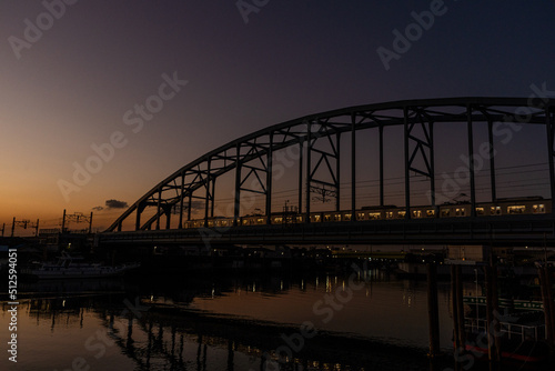 © Kenta, Obraz premium 鉄橋を走る電車と夕暮れ