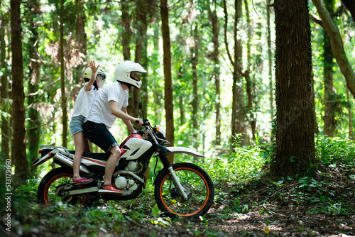 © hakase420, Obraz premium オフロードバイクで山道を走る親子