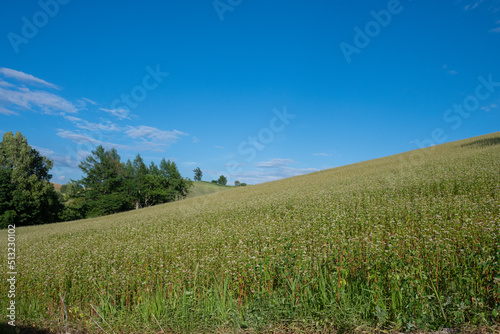 © kinpouge, Fototapeta premium 花が咲いたソバ畑と青空