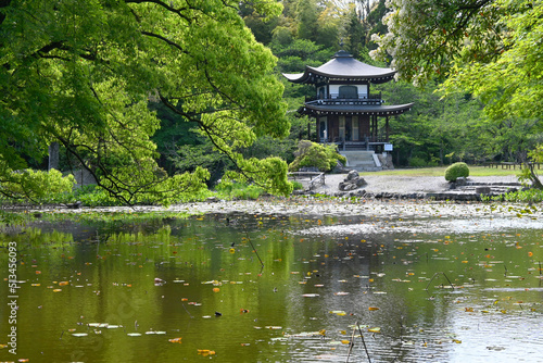 Obraz premium 5月の京都市勧修寺の氷室池と観音堂