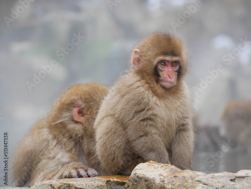 © yummy_you2, Obraz premium 日本、長野県、冬の温泉で毛繕いするニホンザルの親子