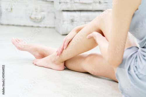 © siro46, Obraz premium リビングで足のスキンケアをする女性