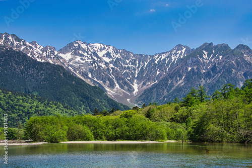 © megustaelbosque2020, Fototapeta premium 青い空に白い雲、さわやかな6月の風に吹かれて、新緑の美しい若葉を眺めながら憧れの上高地を散策