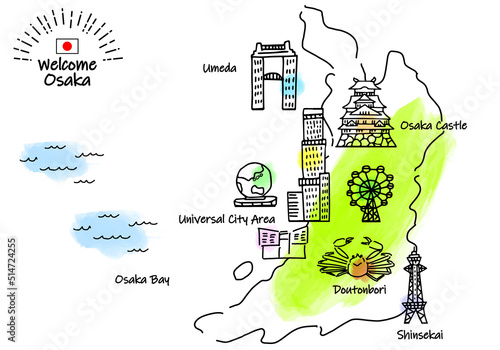 © RURIBYAKU, Fototapeta premium 手描きの大阪地図と観光地のシンプル線画イラスト