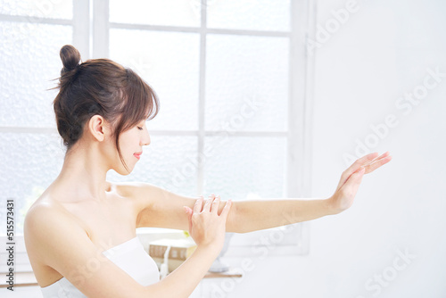 © siro46, Obraz premium リビングで腕のスキンケアをする女性