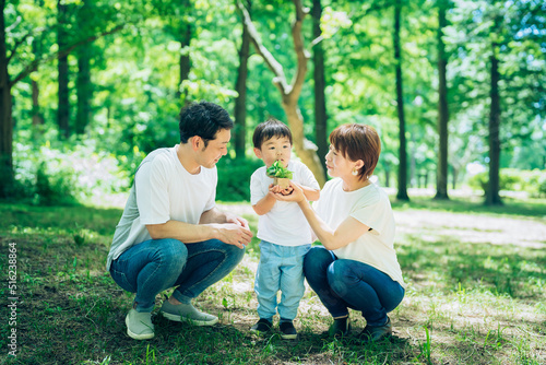 © maru54, Fototapeta premium 森の中で、小さな鉢植えを持つ家族