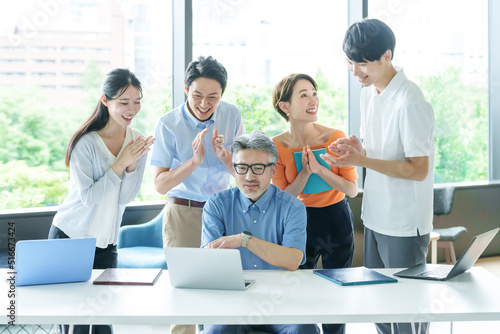 © taka, Obraz premium パソコンを見ながら拍手をするビジネスパーソン
