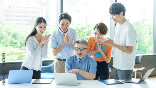 © taka, Obraz premium パソコンを見ながら拍手をするビジネスパーソン