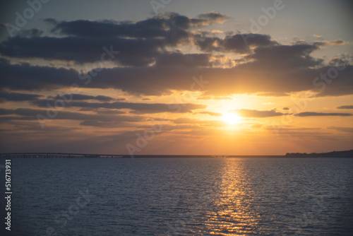 Obraz premium 沖縄の離島 宮古島の美しい夕焼け 夕日に照らされた海と空の風景