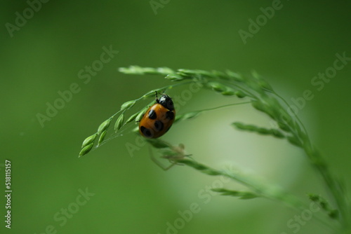 Obraz premium イネ科の植物の穂にとまるナナホシテントウ