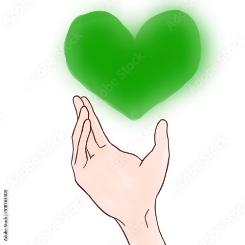 © ひたち 章, Fototapeta premium 緑色のハートに添える手