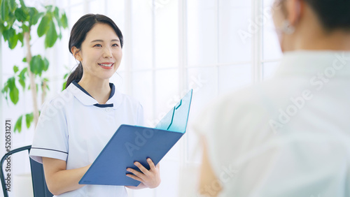 Fototapeta premium 相談を受ける白衣の女性スタッフ